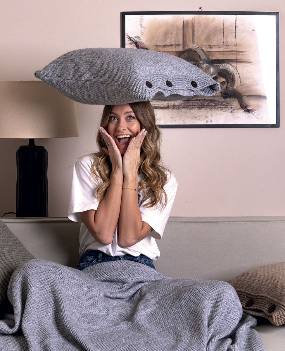 Decorative cushion knitted in solid color with wood button closure and removable filling.