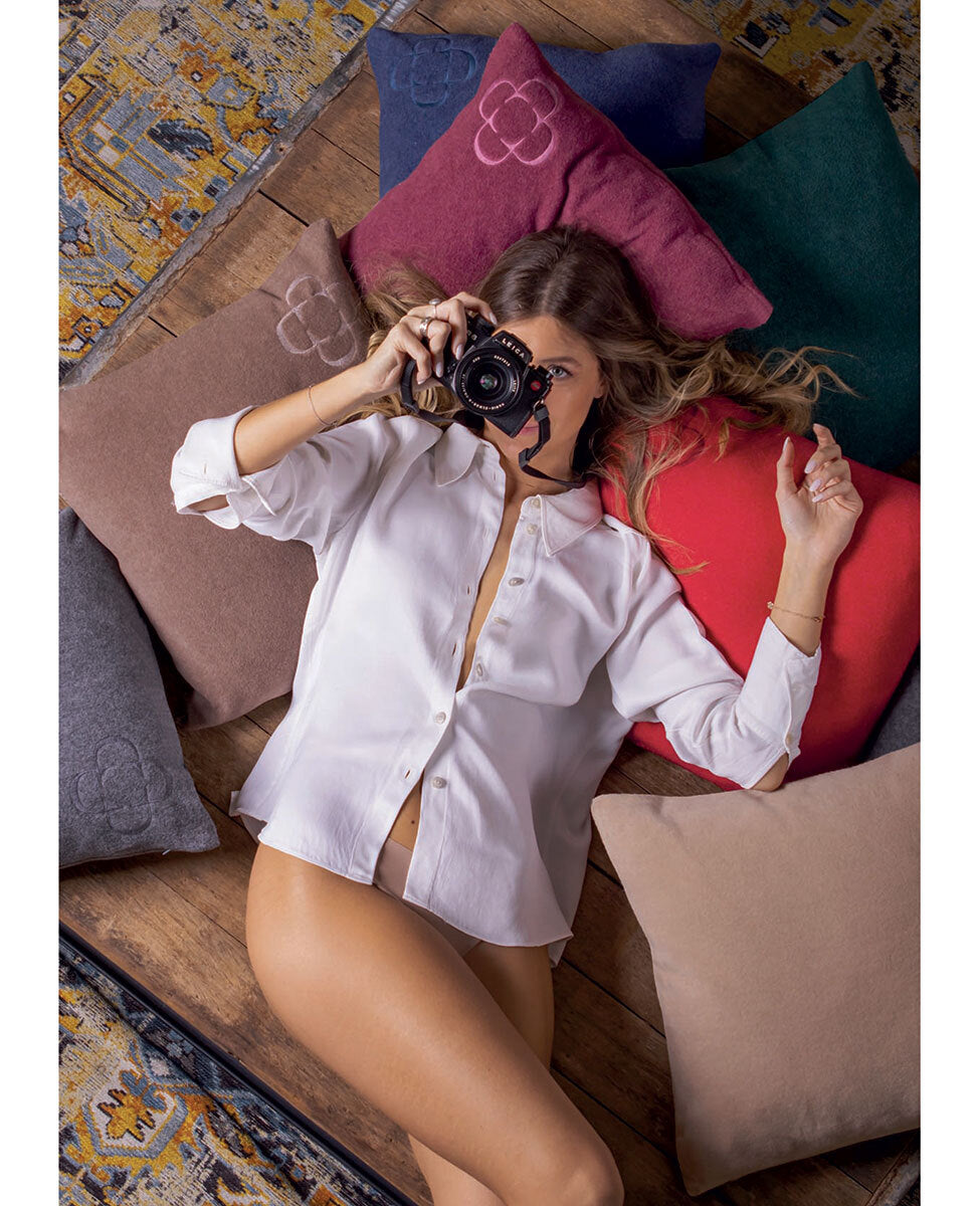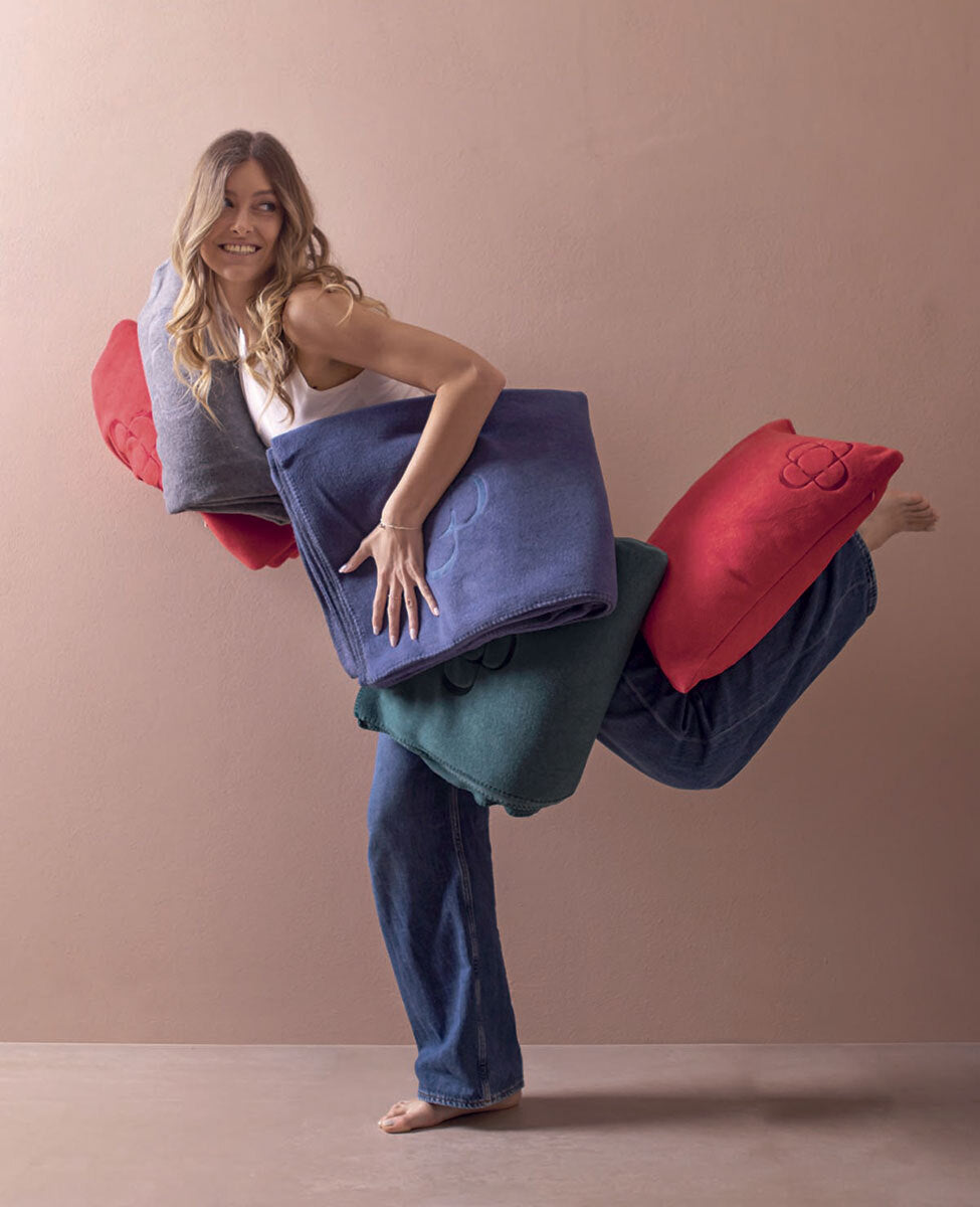 Decorative cushion in soft flee solid color with logo embroidered and removable filling.
